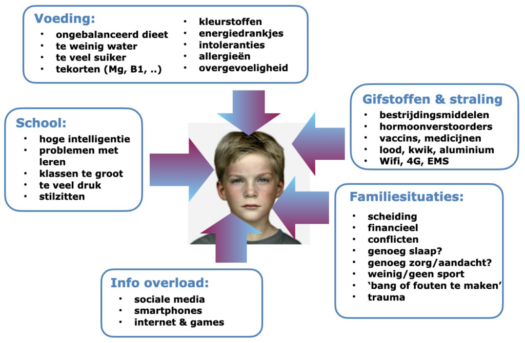 Bekijk het voedingspatroon van het kind zorgvuldig, haal daar de triggers uit zoals suiker, zaadoliën, geraffineerde koolhydraten, sport- en pepdrankjes zoals Red Bull9. Vervang dit met gezonde voeding en vul het aan met vitamines en mineralen. Geef het kind meer extraverte10 bezigheden, zoals sport en/of een leuke hobby, minder introverte11 bezigheden zoals 24/7 social media op de mobiel. Of gewoon ouderwets spelen met vriendjes en vriendinnetjes. Verbaas je niet wat dit al voor een positieve bijdrage kan teweegbrengen.