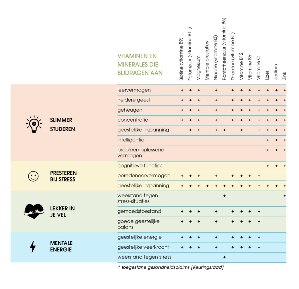 Je ziet dat de B-vitaminen erg belangrijk zijn. Ze zijn goed voor leerprestaties en helpen ook om tijdens het leren en studeren geconcentreerd te blijven. Ook dragen ze bij aan het functioneren van het geheugen, helpen bij geestelijke inspanning, zorgen voor weerstand tijdens stresssituaties en verbeteren de gemoedstoestand.