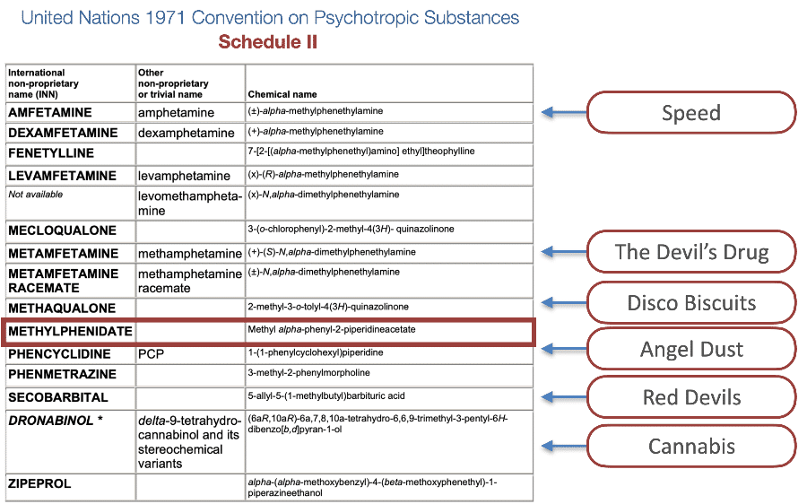 De werkzame stof in ritalin is een chemische stof diemethylphenidaat wordt genoemd. Dit is geenszins een nieuwe stof. Deze stof staat al op dezelfde lijst uit 1971 van de Verenigde Naties als talloze andere gevaarlijke straatdrugs! Drugs waarvan wij als ouders juist hopen dat onze kinderen er niet mee in aanraking komen.