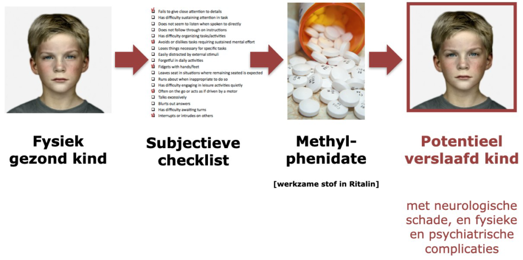Want mocht het kind de pech hebben dat deze subjectieve testen leiden tot een ADHD diagnose, dan krijgt het vaak te maken met de dagelijkse toediening van gevaarlijke psychotrope5 middelen, soms zelfs jarenlang, die slechts de ‘verstoring’ verbloemen en talloze schadelijke bijwerkingen kennen.