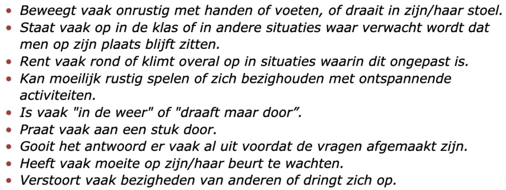 - hyperactiviteit: meer dan de normale, onnodige motorische activiteit. Onrustig zijn, veel bewegen, moeite met stilzitten, overmatig praten en innerlijke rusteloosheid. ↩︎