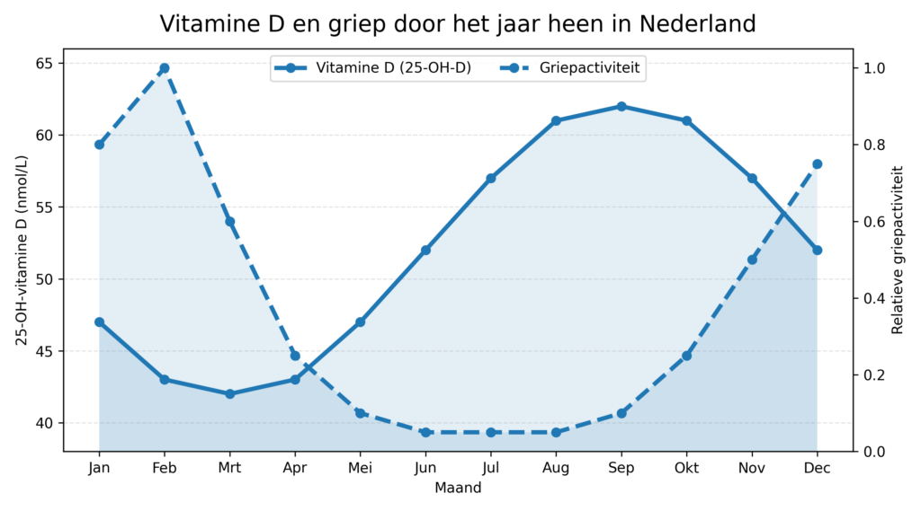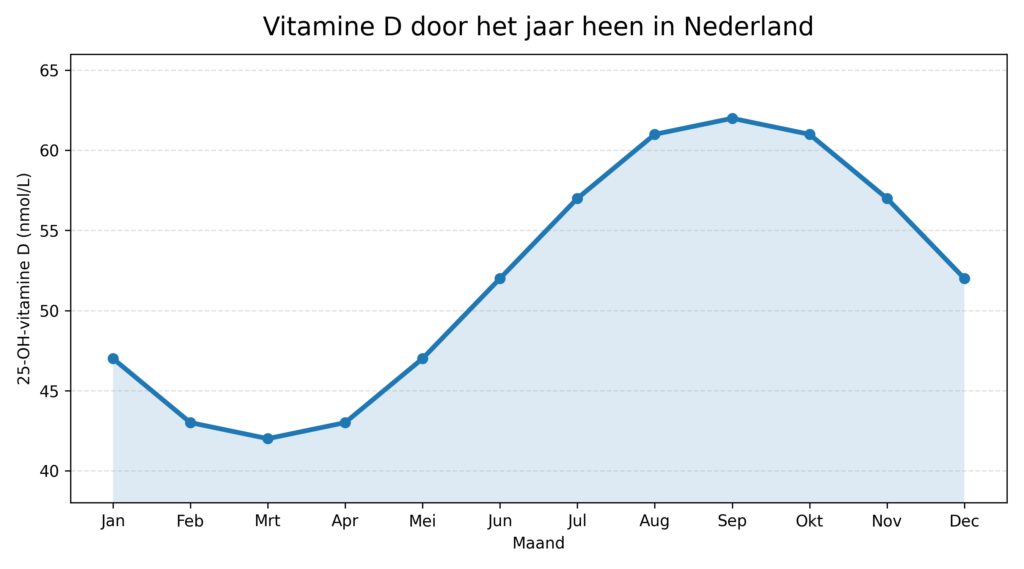 Deze gegevens zijn gebaseerd op meerdere Nederlandse studies, die dit golfvormige jaarpatroon exact tonen. Ook het RIVM en de Gezondheidsraad beschrijven consequent dat de aanmaak van vitamine D3 door de zon onvoldoende is van oktober t/m april.