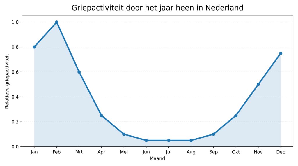 Dat patroon is vrijwel identiek van jaar tot jaar (met kleine verschuivingen). De onderstaande afbeelding toont deze gemiddelde griepactiviteit in Nederland: