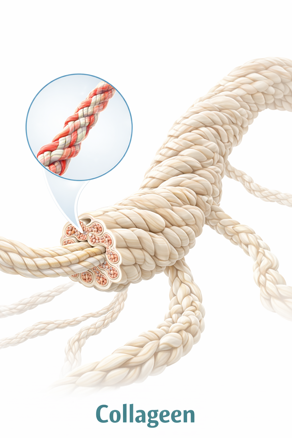 Collageen vormt de basis van vrijwel al het bindweefsel in je lichaam. Je kunt het zien als een soort lijm en verstevigend netwerk dat het hele lichaam bij elkaar houdt, alles omringt en je lichaam zijn structuur geeft.