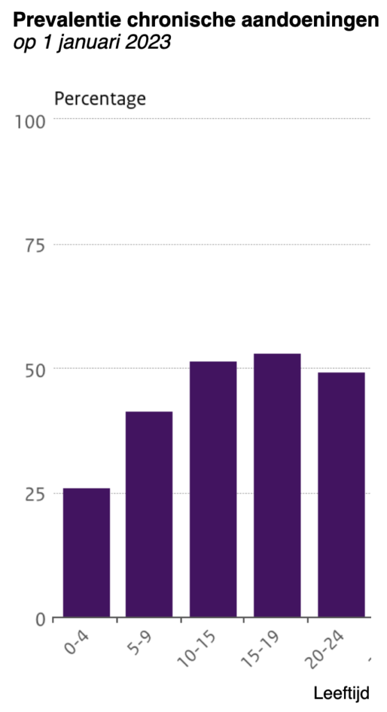 Helaas blijkt het tegendeel waar. Het is teleurstellend om te moeten zien dat veel kinderen en jongeren met chronische aandoeningen te maken hebben. Van de groep onder 24 jaar heeft maar liefst 45% één of meerdere chronische aandoeningen.