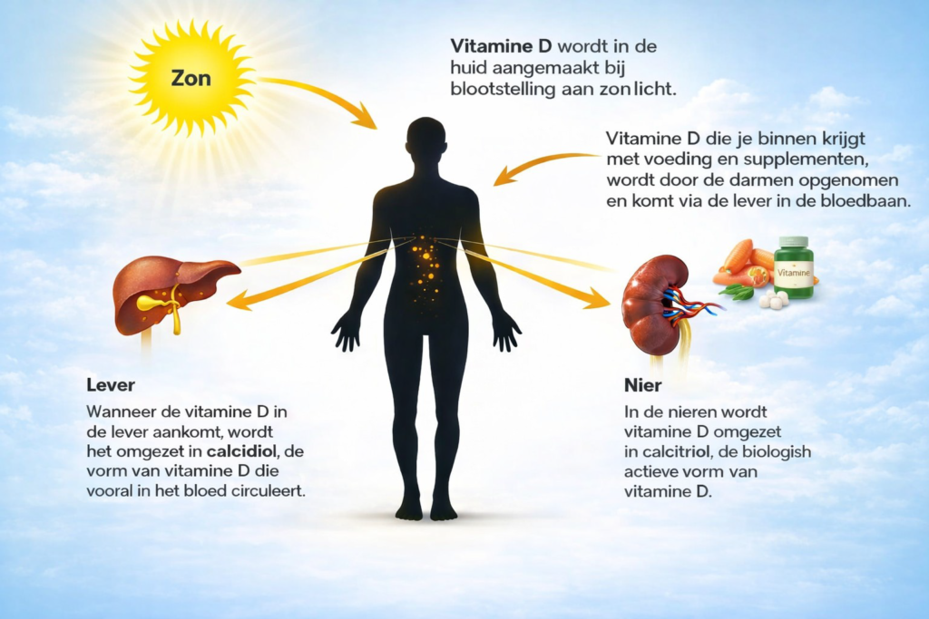 De meeste vitaminen moet je uit voeding halen, terwijl je lichaam vitamine D3 zelf produceert wanneer de huid wordt blootgesteld aan zonlicht. Vandaar dat vitamine D3 ook wel de ‘zonvitamine’ wordt genoemd. Onder invloed van zonlicht (met name UV-B5 straling) wordt in de huid cholesterol omgezet in vitamine D3. Lever en nieren zetten het vervolgens om in de actieve vorm (calcitriol).