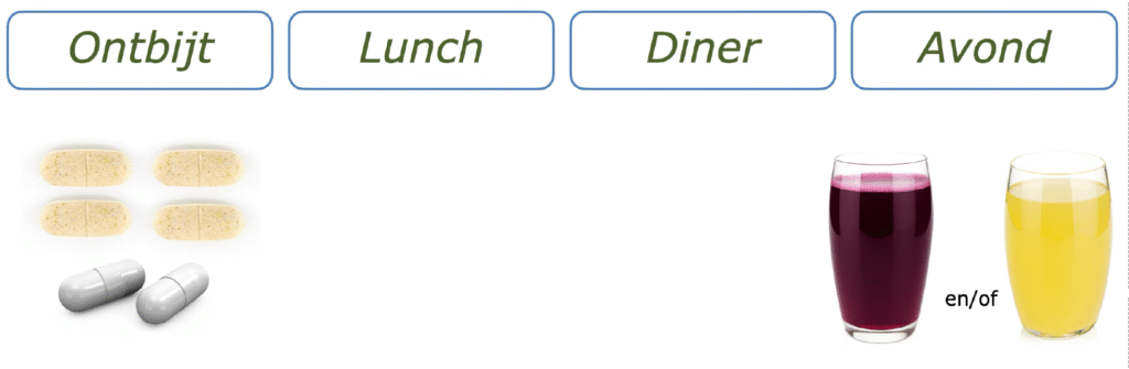 Als je het lastig vindt of het weleens vergeet om de supplementen bij de lunch en het diner te nemen, zoals ik, dan kan je er ook voor kiezen om alle dagelijkse multivitaminen en vitamine C in een keer met een goed ontbijt te nemen; dan zou je alleen nog het  Mineraaldrankje in de avond moeten nemen.
