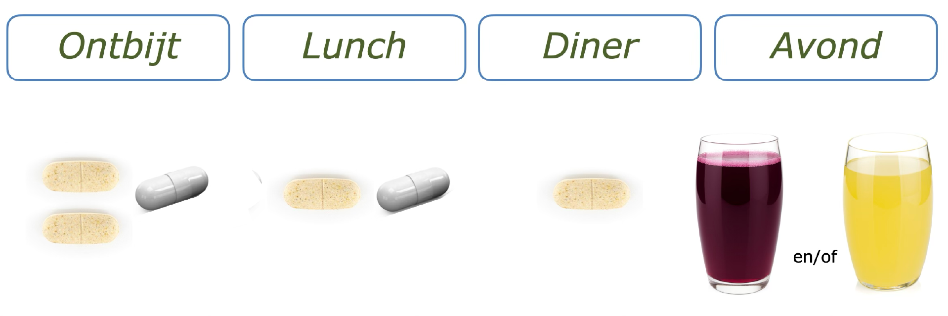 Je kunt nu eenvoudig met de maaltijden de multivitaminen en vitamine C nemen terwijl je het Mineraaldrankje bijvoorbeeld na het sporten of in de avond neemt.