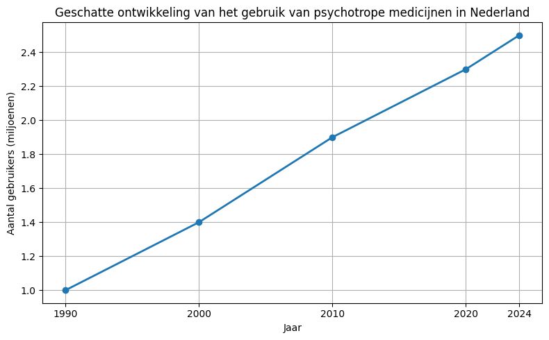 10. bron: De grafiek die ik maakte gebruikt benaderingen op basis van bekende cijfers per medicijncategorie, omdat antidepressiva, benzodiazepinen, antipsychotica en ADHD-medicatie allemaal aparte statistieken hebben. Het totaal van ±2,5 miljoen gebruikers komt uit de analyses van o.a.: GIPdatabank, Zorginstituut Nederland, journalistieke analyses van medicijngebruik. ↩︎