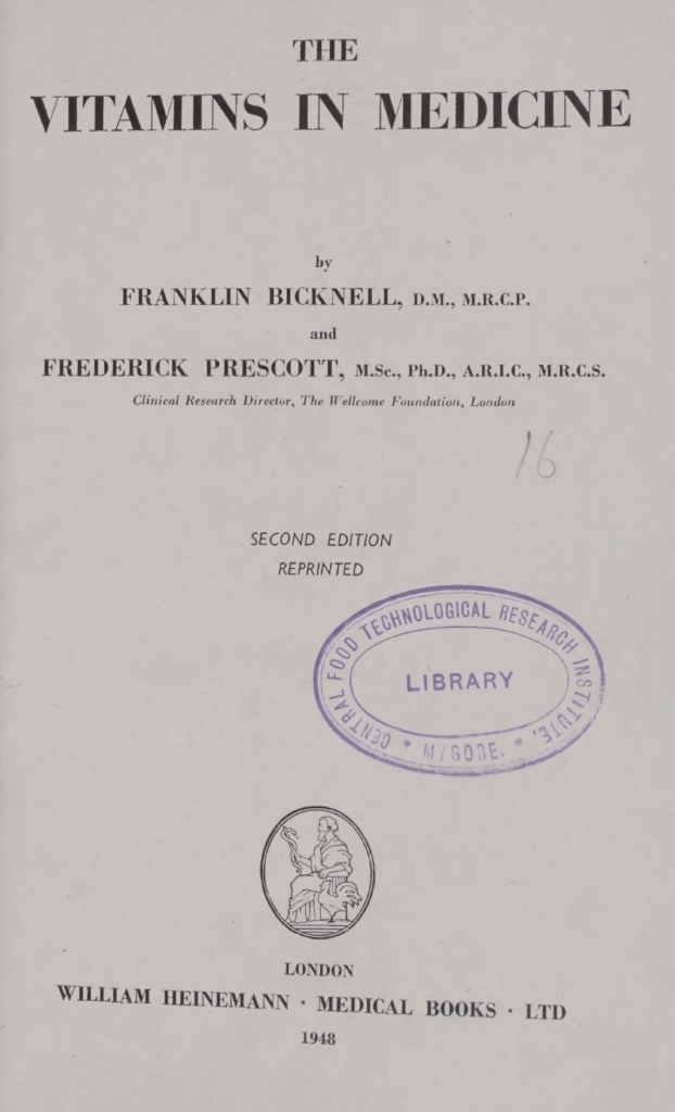 4. Franklin Bicknell: een Britse arts, voedingsonderzoeker en auteur (1906–1964) die vooral bekend werd door zijn invloedrijke boek over vitamines in de geneeskunde. [https://en.wikipedia.org/wiki/Franklin_Bicknell] ↩︎