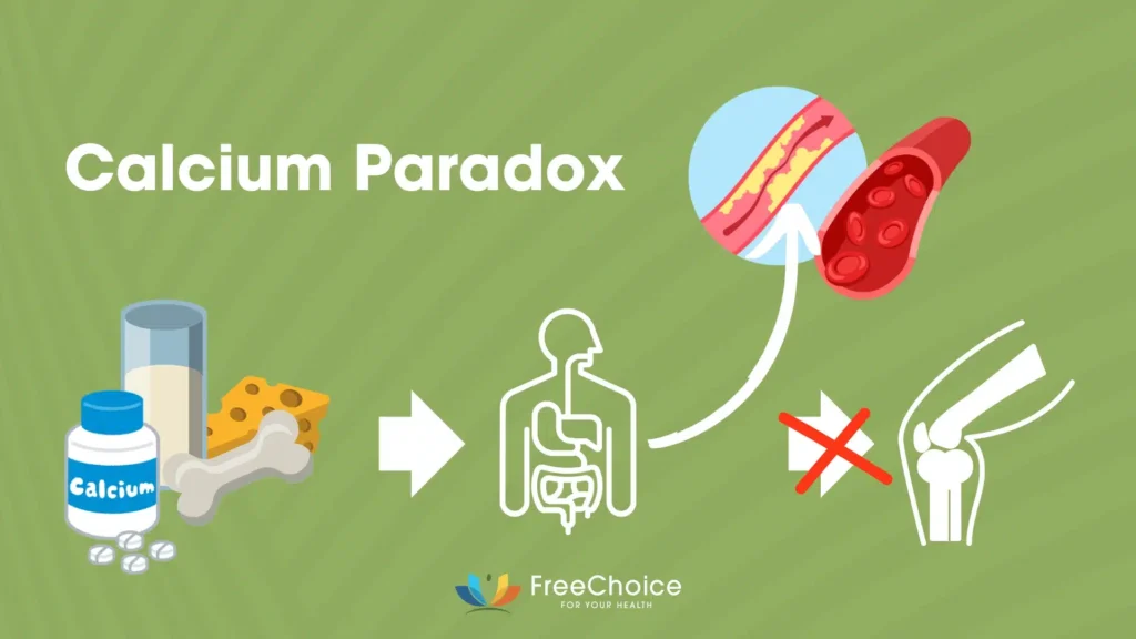Wanneer calcium wordt geconsumeerd (via de voeding of als supplement), zou het vooral naar het botweefsel en de tanden moeten gaan. Maar helaas kan het calcium ook in andere weefsels waaronder de bloedvaten terechtkomen waar het de verkalking kan veroorzaken. Dit wordt de calcium paradox5 genoemd.