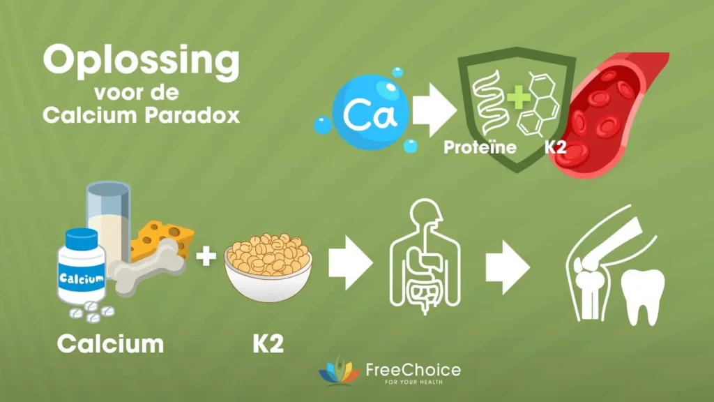 Het is gebleken dat vitamine K2 de oplossing is voor de calcium paradox. Het is niet genoeg om alleen maar calcium te nemen. Het moet in het lichaam op een correcte manier verwerkt en gebruikt worden. Vitamine K2 activeert zowel het eiwit dat de neerslag in de bloedvaten voorkomt alsook het eiwit dat ervoor zorgt dat calcium aan het botweefsel wordt gebonden. Dus simpel gezegd, de activatie van deze twee eiwitten zorgt ervoor dat calcium naar het botweefsel gaat in plaats van naar de bloedvaten en andere weefsels.