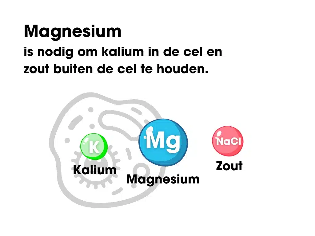 - Magnesium is nodig om kalium in de cel en zout buiten de cel te houden.