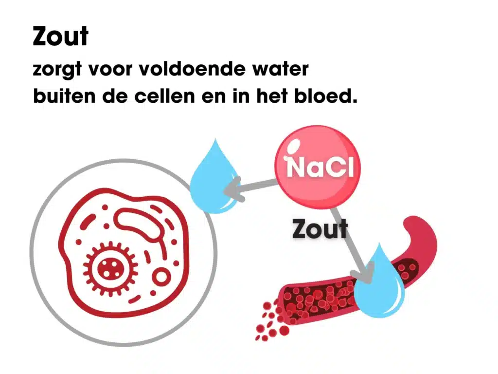 - Zout (natrium en chloride) zorgt voor voldoende water buiten de cellen en in het bloed.