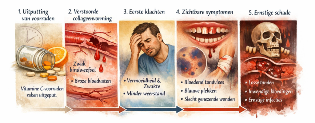 - Daarna komen de zichtbare symptomen aan bod zoals bloedend tandvlees, blauwe plekken, slecht genezende wonden en gewrichtspijn.
