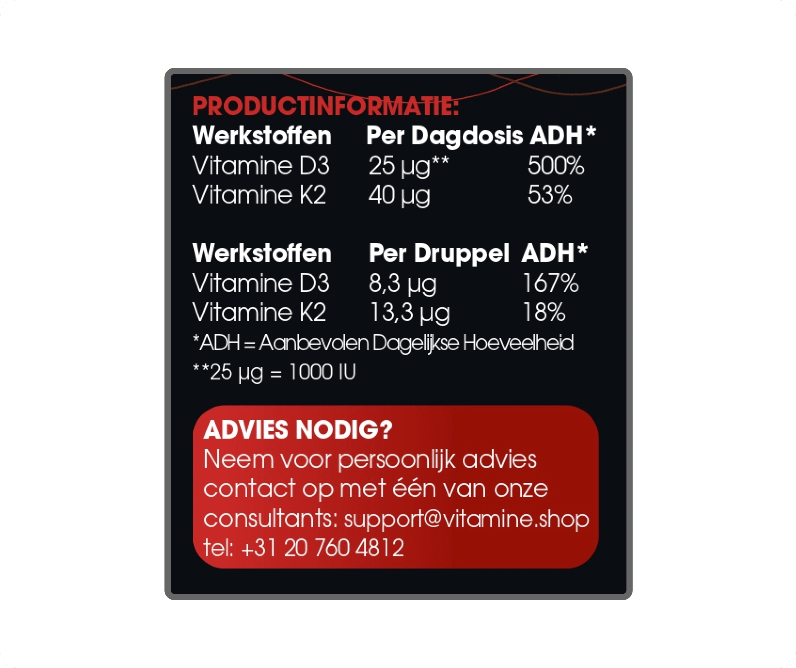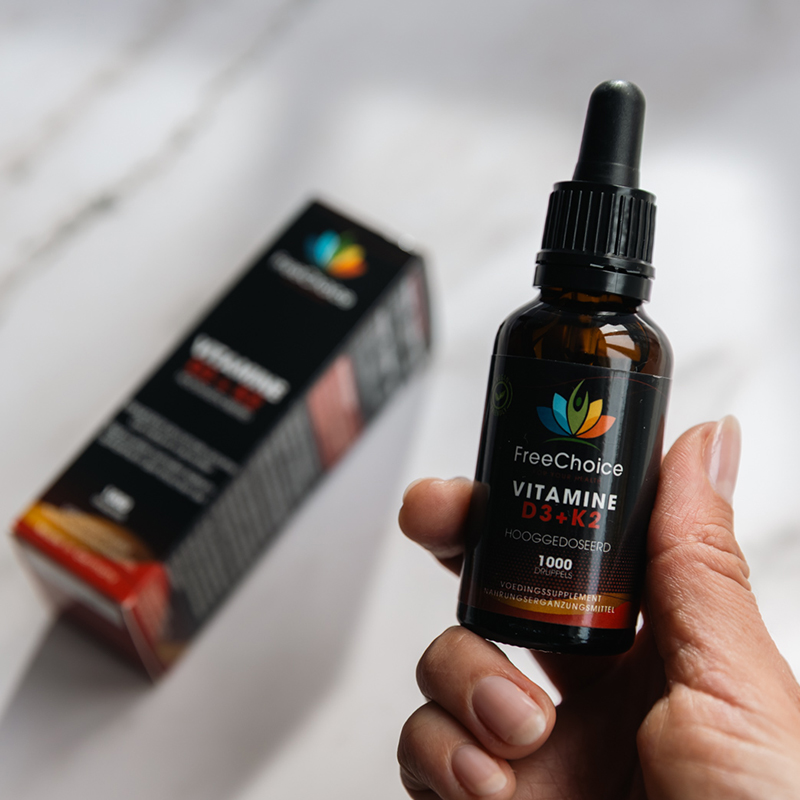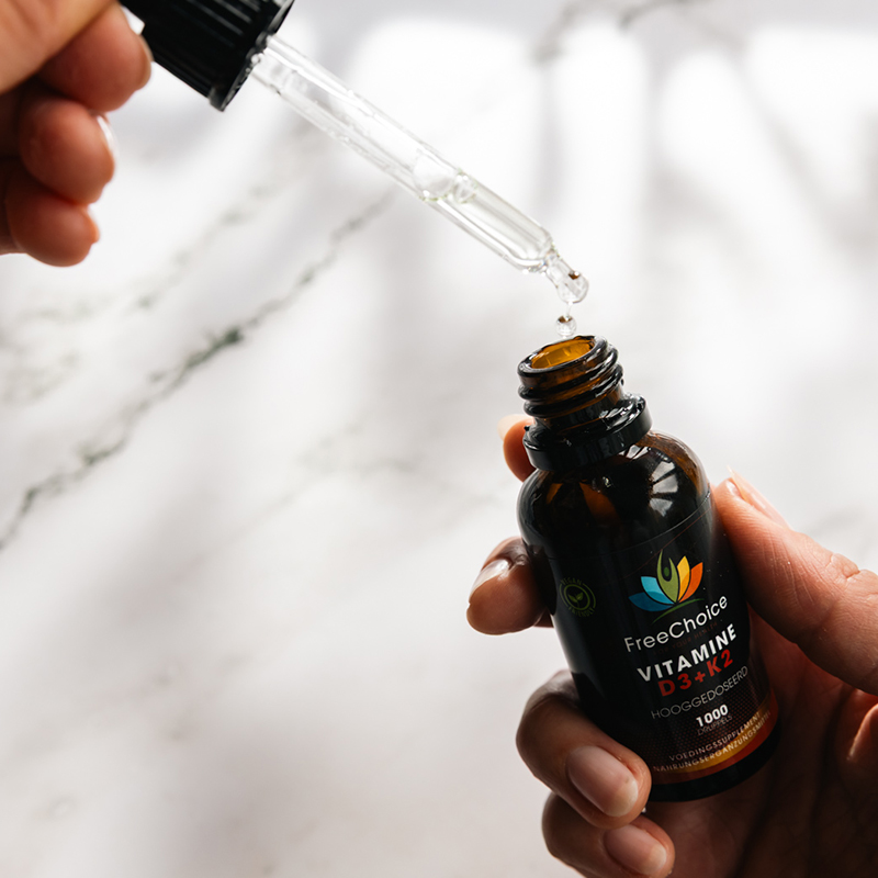 • Hooggedoseerde en kwalitatieve vitamine D3 en K2 druppels.