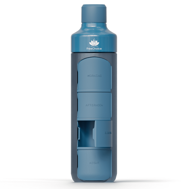 De FreeChoice vitamine doosje in fles biedt je de mogelijkheid om altijd en overal je supplementen in te nemen. De combinatie van een overzichtelijke pillendoos en een duurzame herbruikbare waterfles maken dit product bovendien uiterst functioneel. De pillendoos klik je eenvoudig aan de waterfles via een magneet. Hierdoor hoef je onderweg óf thuis nooit meer een supplement te missen!
