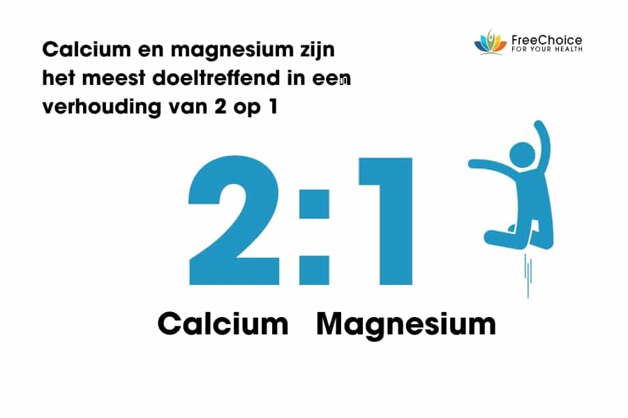 De gunstige effecten van calcium hangen onder andere af van voldoende magnesium. Zo hebben we ook van magnesium vooral baat als er tegelijkertijd voldoende calcium aanwezig is. Calcium en magnesium zijn het doeltreffendst in een verhouding van 2:1.
