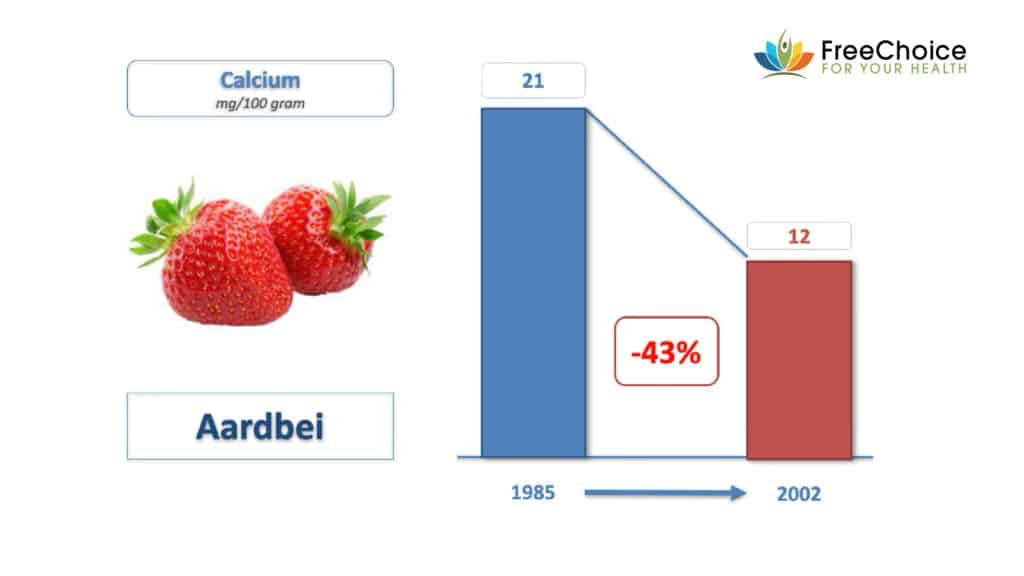 - In aardbeien is de hoeveelheid calcium gedaald met 43%