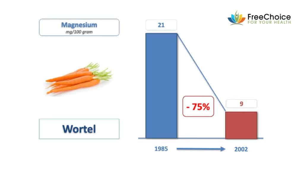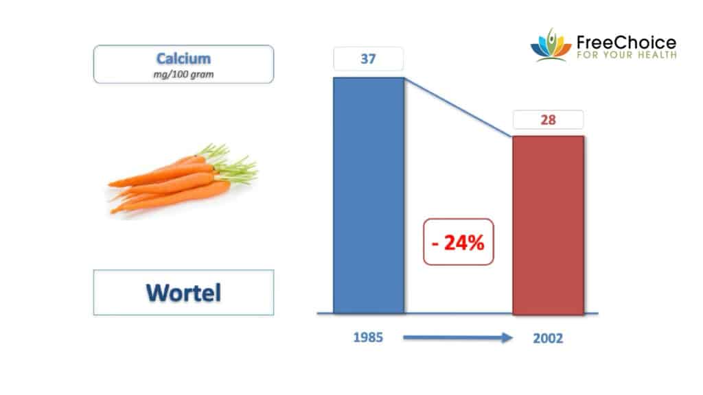 - In wortels is de hoeveelheid calcium gedaald met 24% en magnesium met maar liefst 75%.