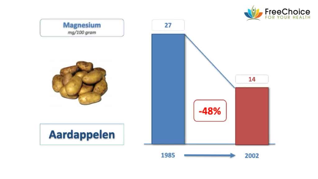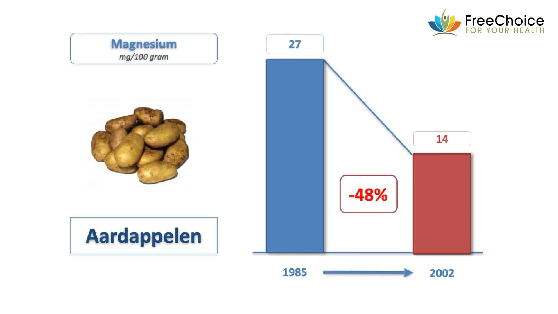 Uit Nederlands onderzoek5 is gebleken dat de hoeveelheid calcium en magnesium in fruit en groenten over de jaren gedaald is. Enkele voorbeelden:
